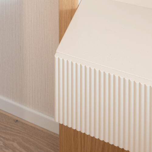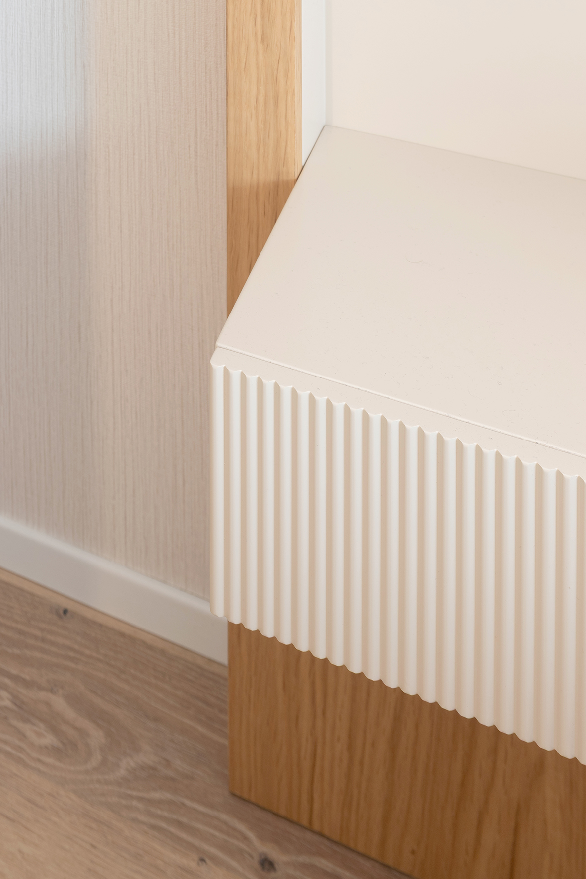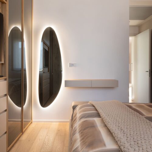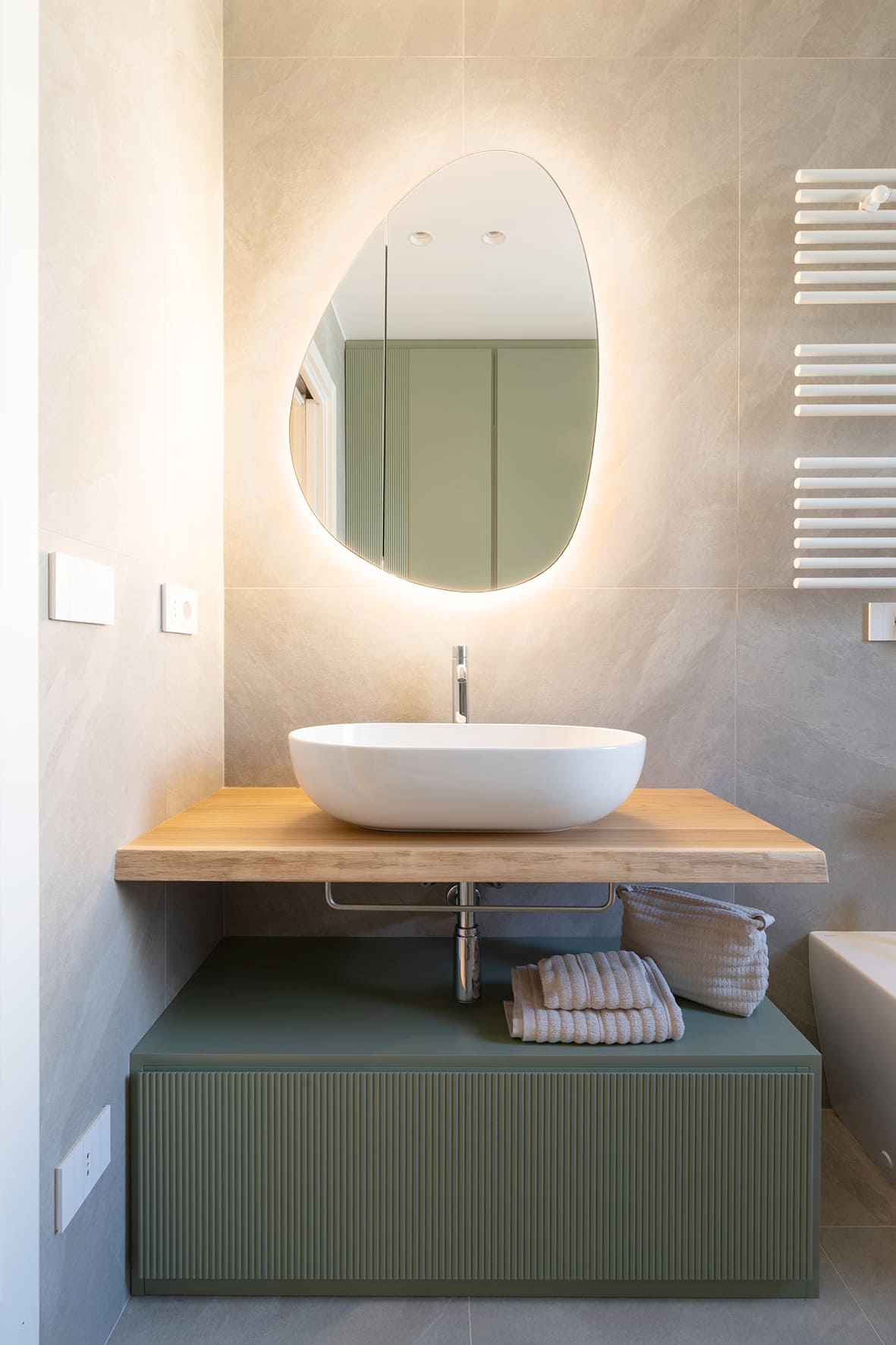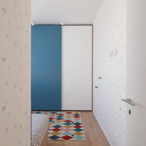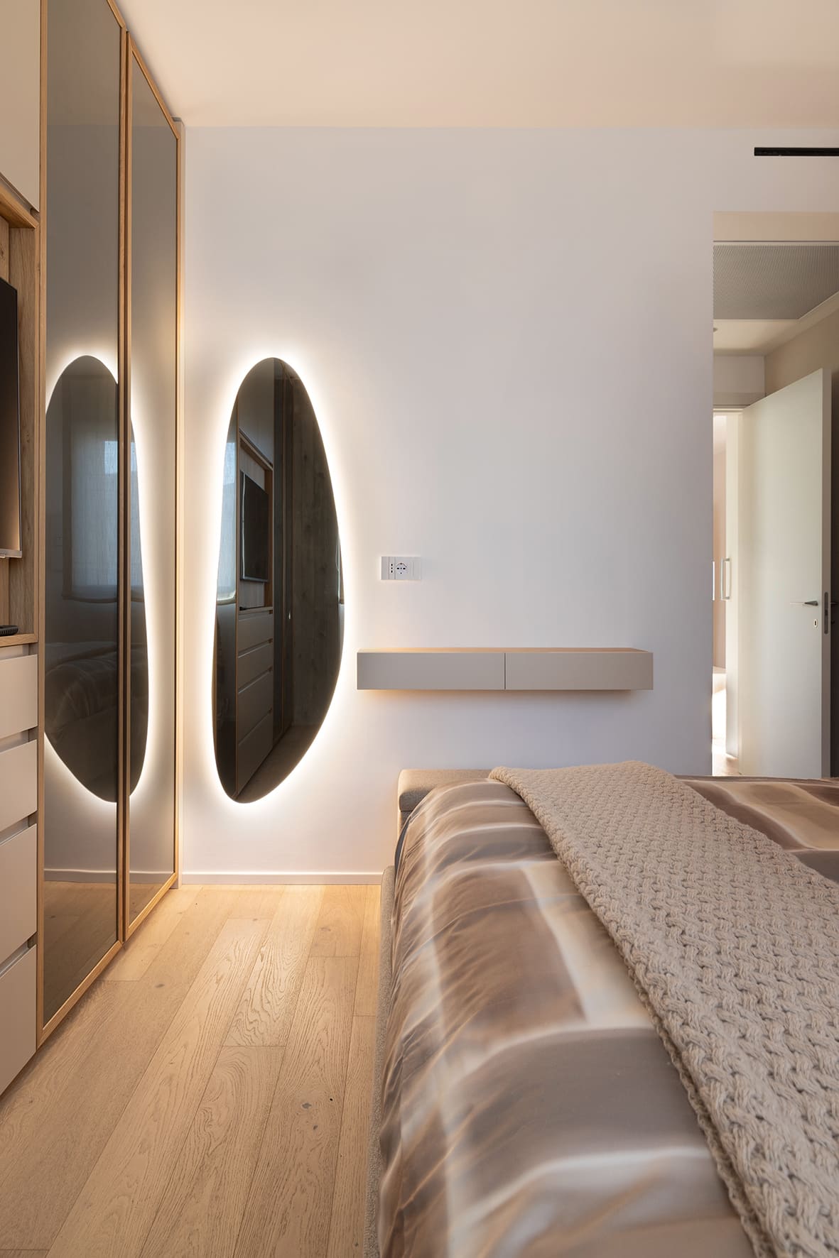 C’è un elemento silenzioso che attraversa tutta la casa: le fresature degli arredi. Abbiamo scelto un motivo che donasse movimento e “bossa” — quel ritmo delicato che rompe la staticità — trasformandolo nel filo conduttore che lega il soggiorno alla zona notte. Dalle camere con armadiature a muro integrate alla lavanderia “invisibile”, fino alle specchiere disegnate esclusivamente per questa famiglia: ogni centimetro è stato ottimizzato. Perché in 70 mq lo spazio non manca mai, se la progettazione è attenta a ogni singola esigenza quotidiana.