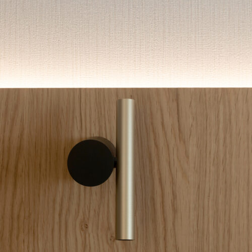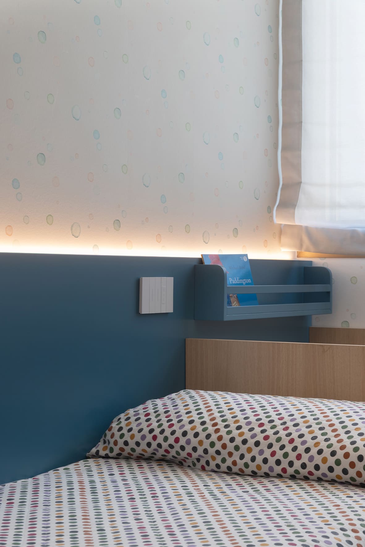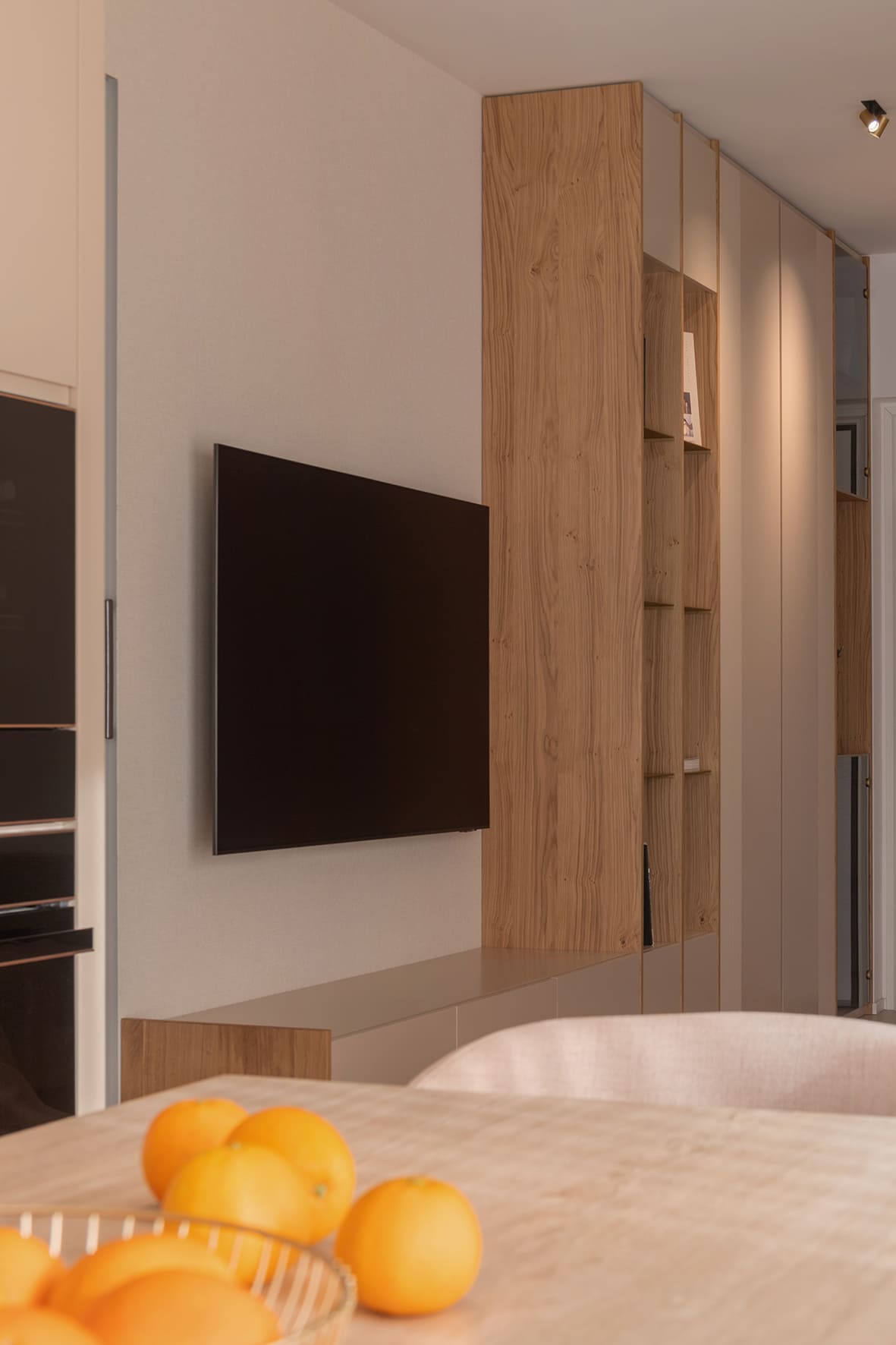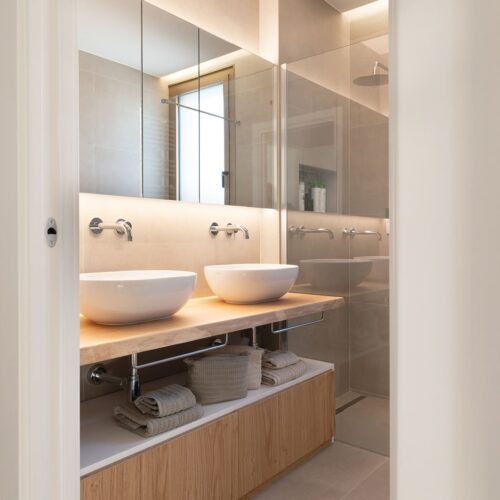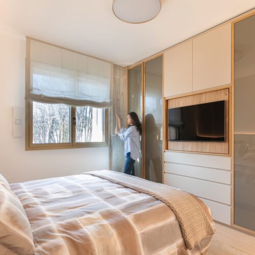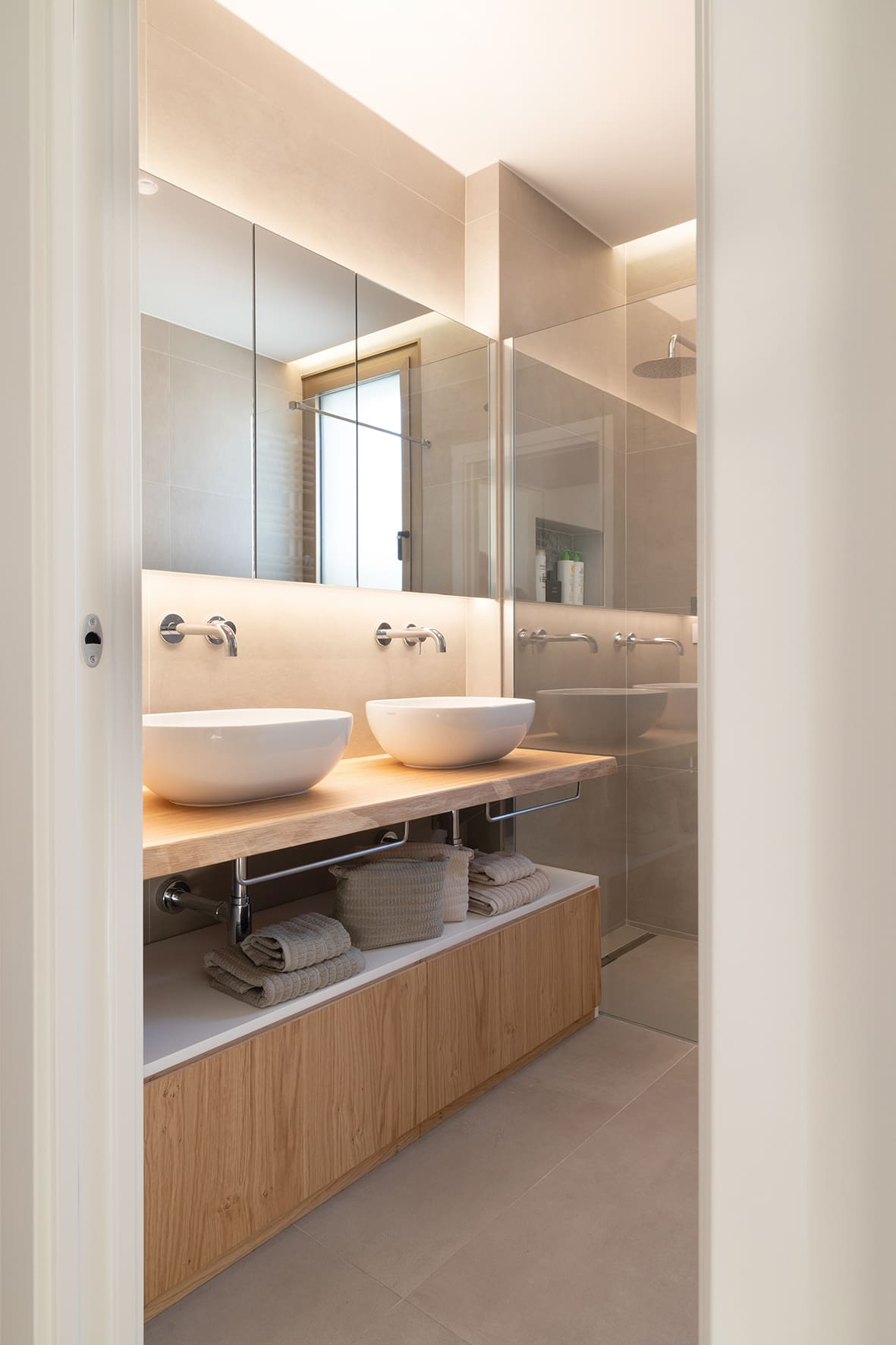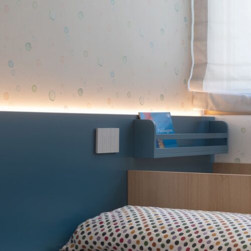 C’è un elemento silenzioso che attraversa tutta la casa: le fresature degli arredi. Abbiamo scelto un motivo che donasse movimento e “bossa” — quel ritmo delicato che rompe la staticità — trasformandolo nel filo conduttore che lega il soggiorno alla zona notte. Dalle camere con armadiature a muro integrate alla lavanderia “invisibile”, fino alle specchiere disegnate esclusivamente per questa famiglia: ogni centimetro è stato ottimizzato. Perché in 70 mq lo spazio non manca mai, se la progettazione è attenta a ogni singola esigenza quotidiana.