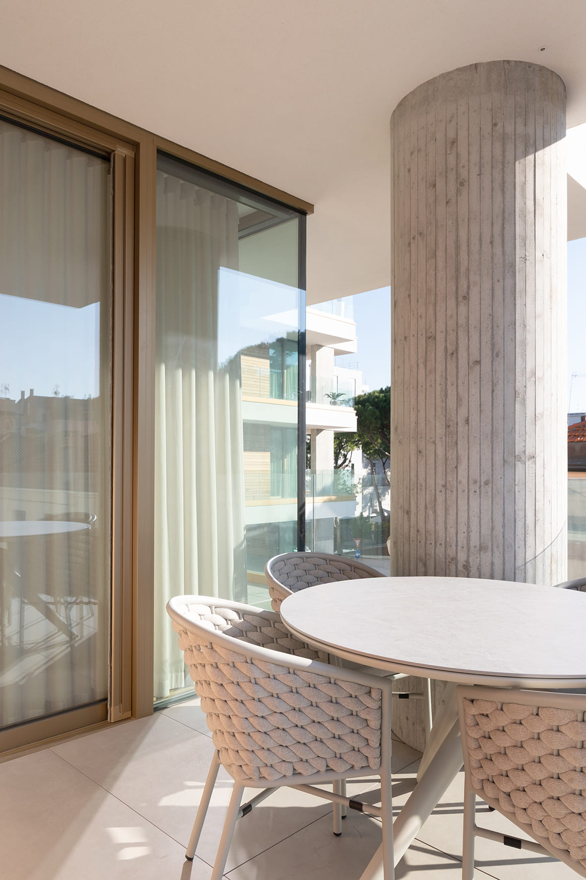 Progettare all’interno di un fabbricato di pregio ha richiesto un approccio di profondo rispetto. Non potevamo ignorare ciò che accade fuori dalle finestre: la luce dell’Adriatico e le linee architettoniche del palazzo entrano negli ambienti, creando una continuità visiva tra interno ed esterno. Abbiamo scelto materiali come il rovere e dettagli metallici per dare carattere, bilanciando la palette cromatica calda con la pulizia delle forme.