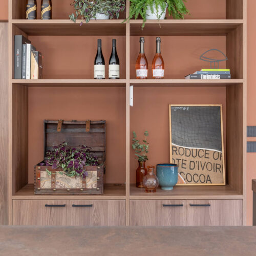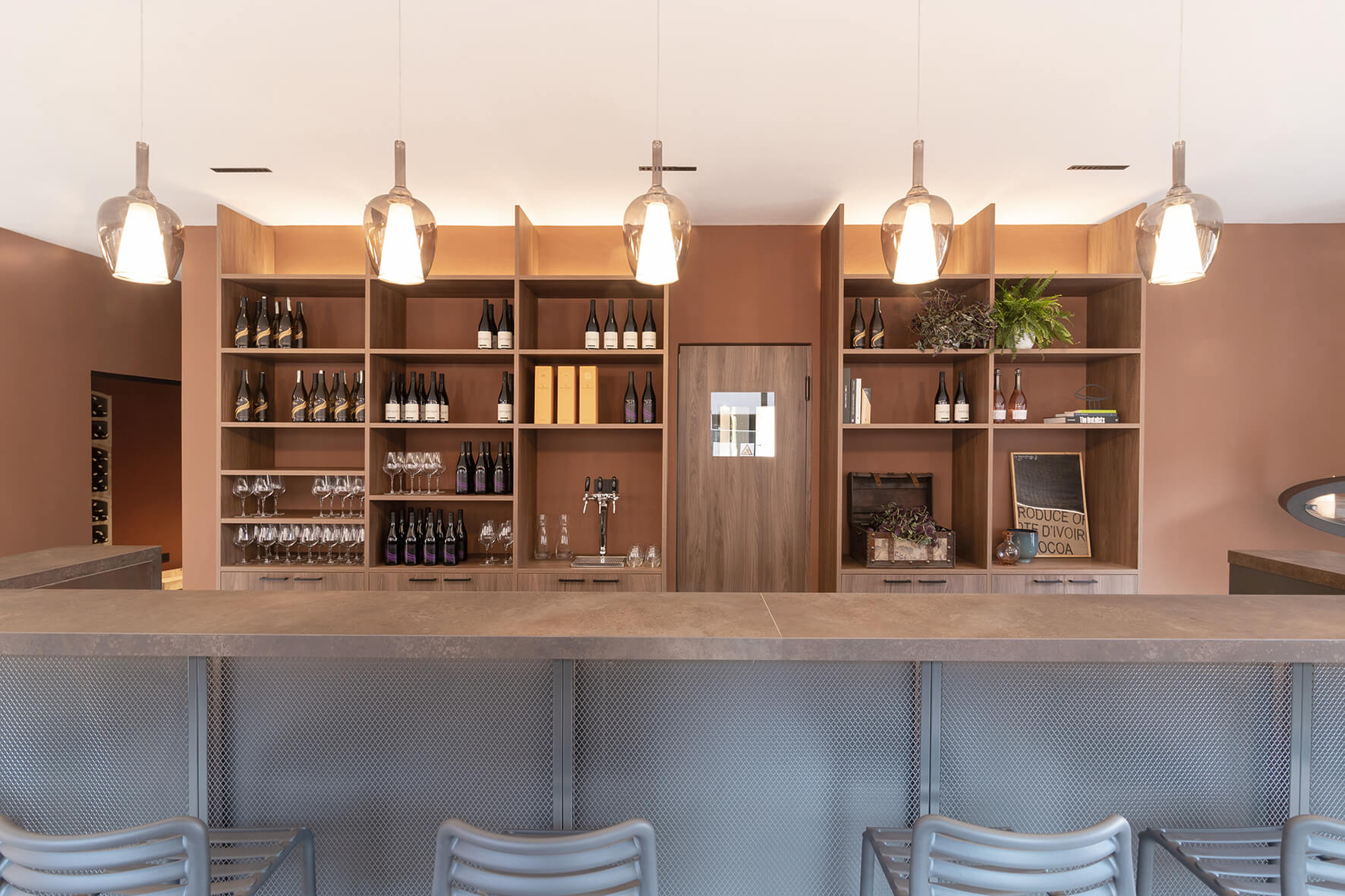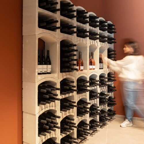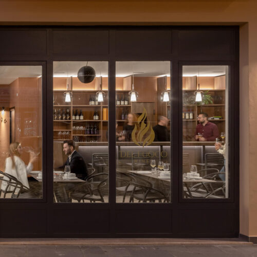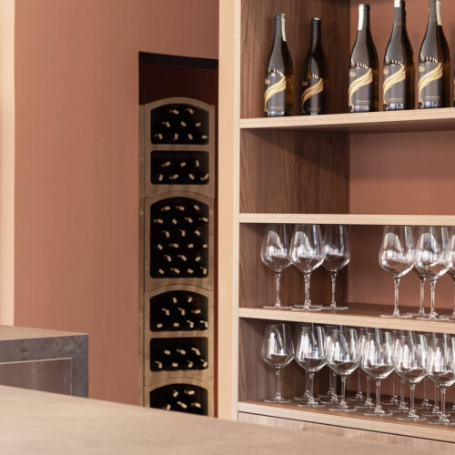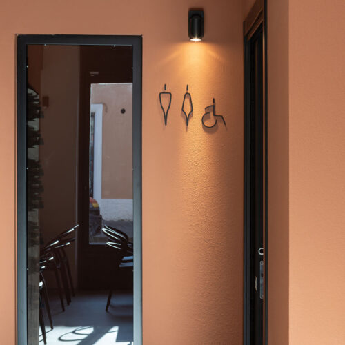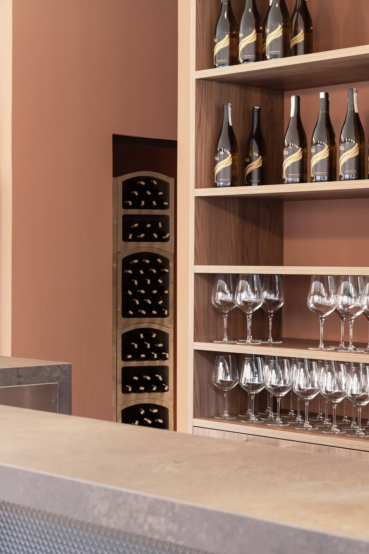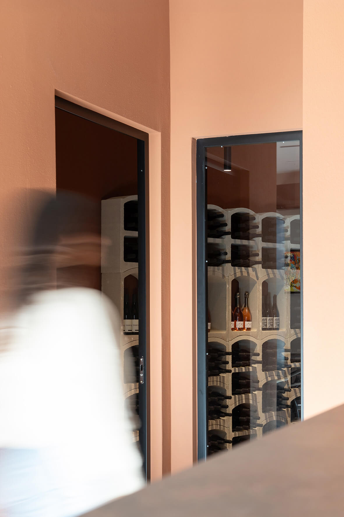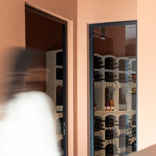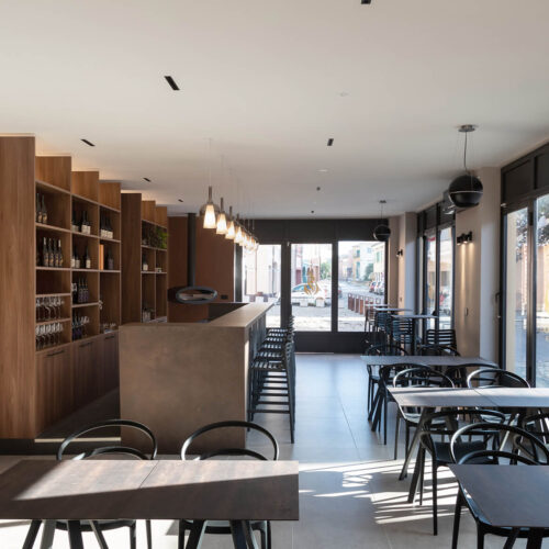 Il locale originariamente era una pizzeria. La modifica più significativa apportata fu quella di eliminare il vecchio forno per creare un layout più spazioso e con flussi più armonici. Dal punto di vista distributivo, la sala in fondo, dove prima c’erano i tavoli, dà spazio alla cantina espositiva e ai servizi. La cantina espositiva è l’elemento che rompe con la formalità, anche dal punto di vista distributivo. Enfasi sugli elementi ad arco per l’esposizione delle etichette e la porta installata su un muro inclinato, che incuriosisce e invita i clienti ad addentrarsi.